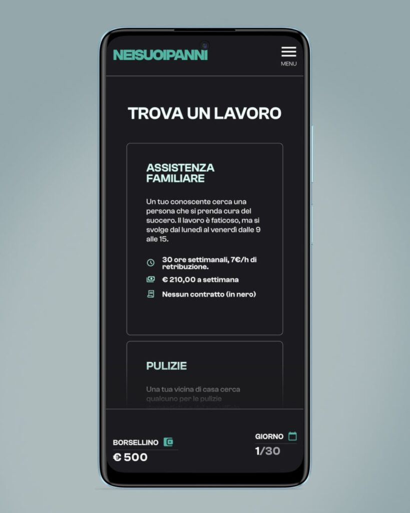 NeiSuoiPanni è un simulatore che, in modo realistico e coinvolgente, invita a mettersi nei panni di chi vive situazioni di povertà e deve affrontare scelte e imprevisti